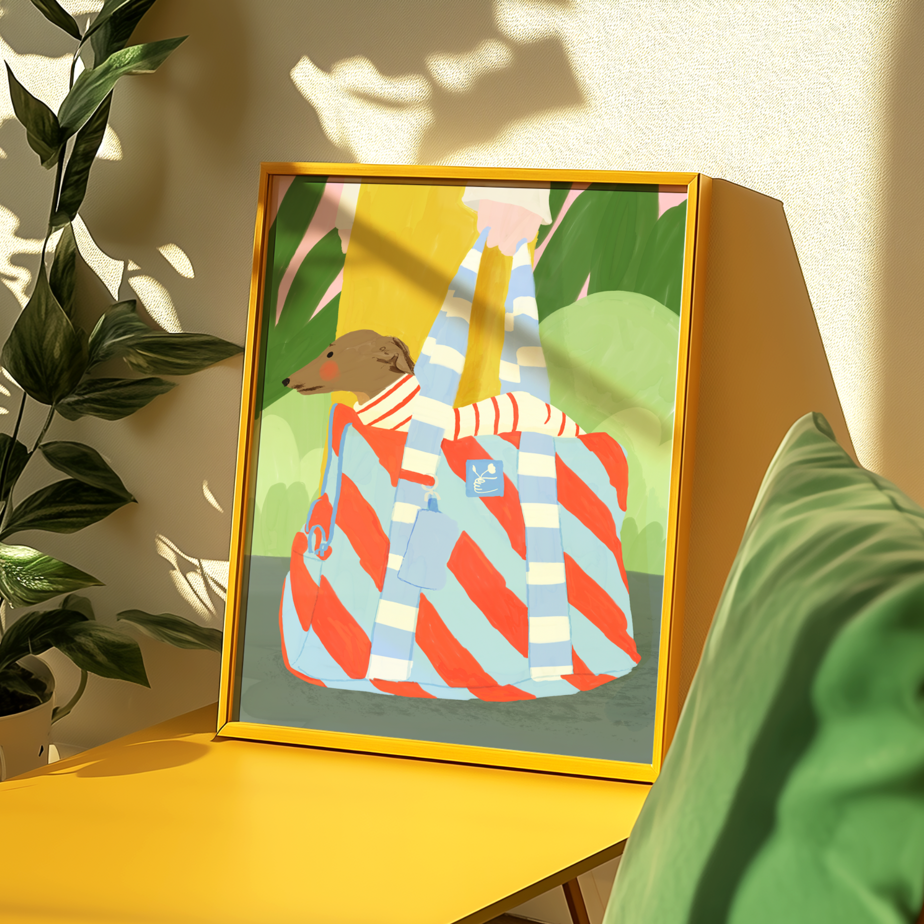 Descubre la lámina ilustrada GALGO, que captura con encanto a una chica cuyo galgo ocupa el protagonismo desde su bolso. Solo se asoma la falda de la joven, destacando la elegancia y sutileza de esta divertida escena. Ideal para amantes del arte y los perros, aporta un toque juguetón y sofisticado a cualquier espacio.